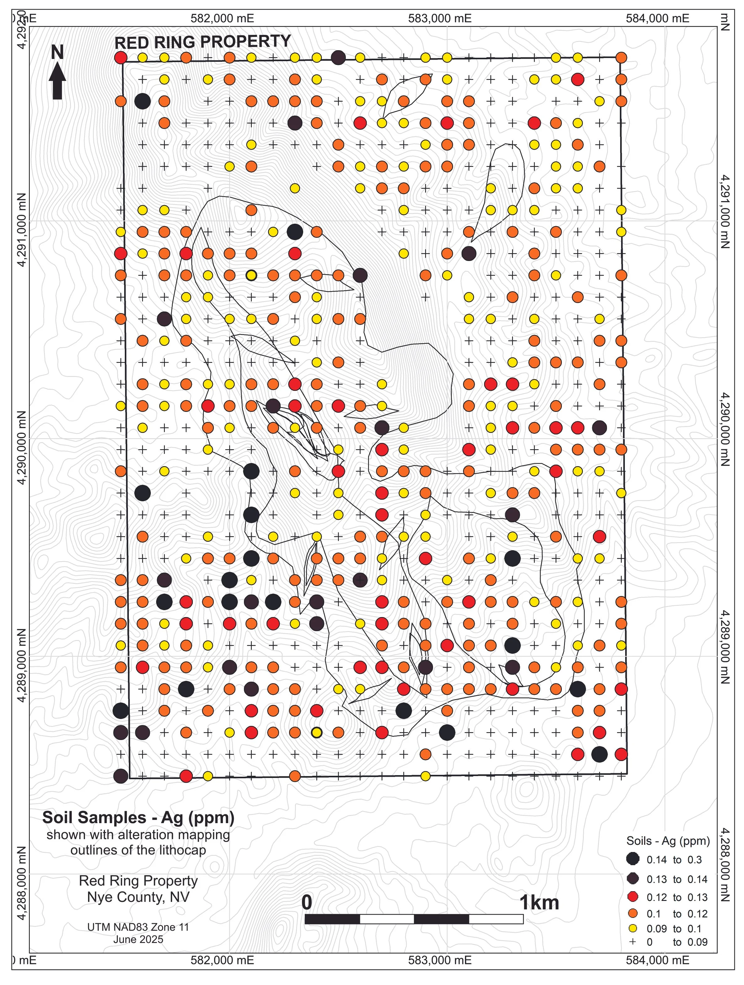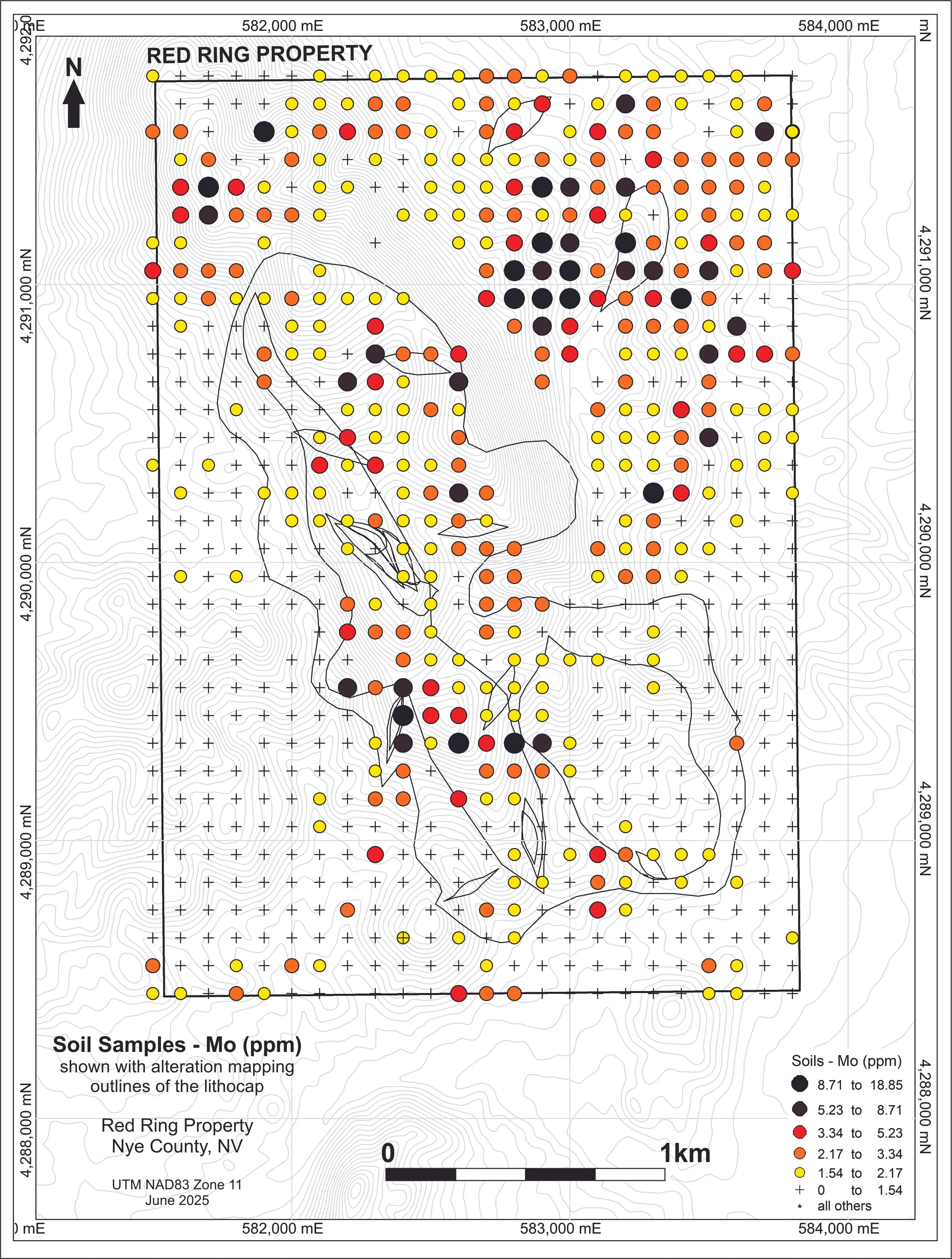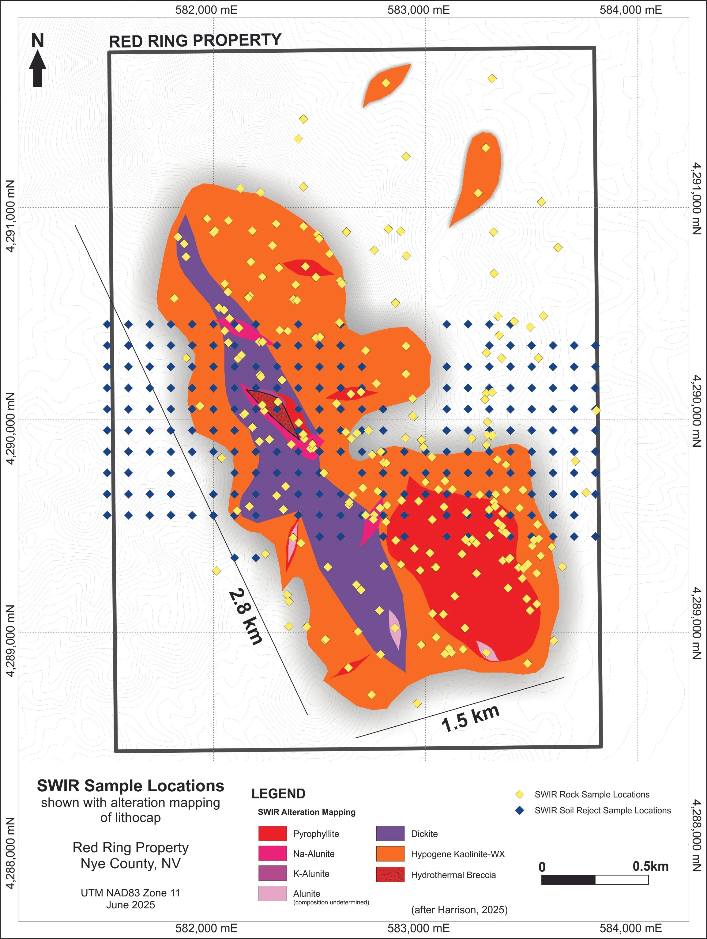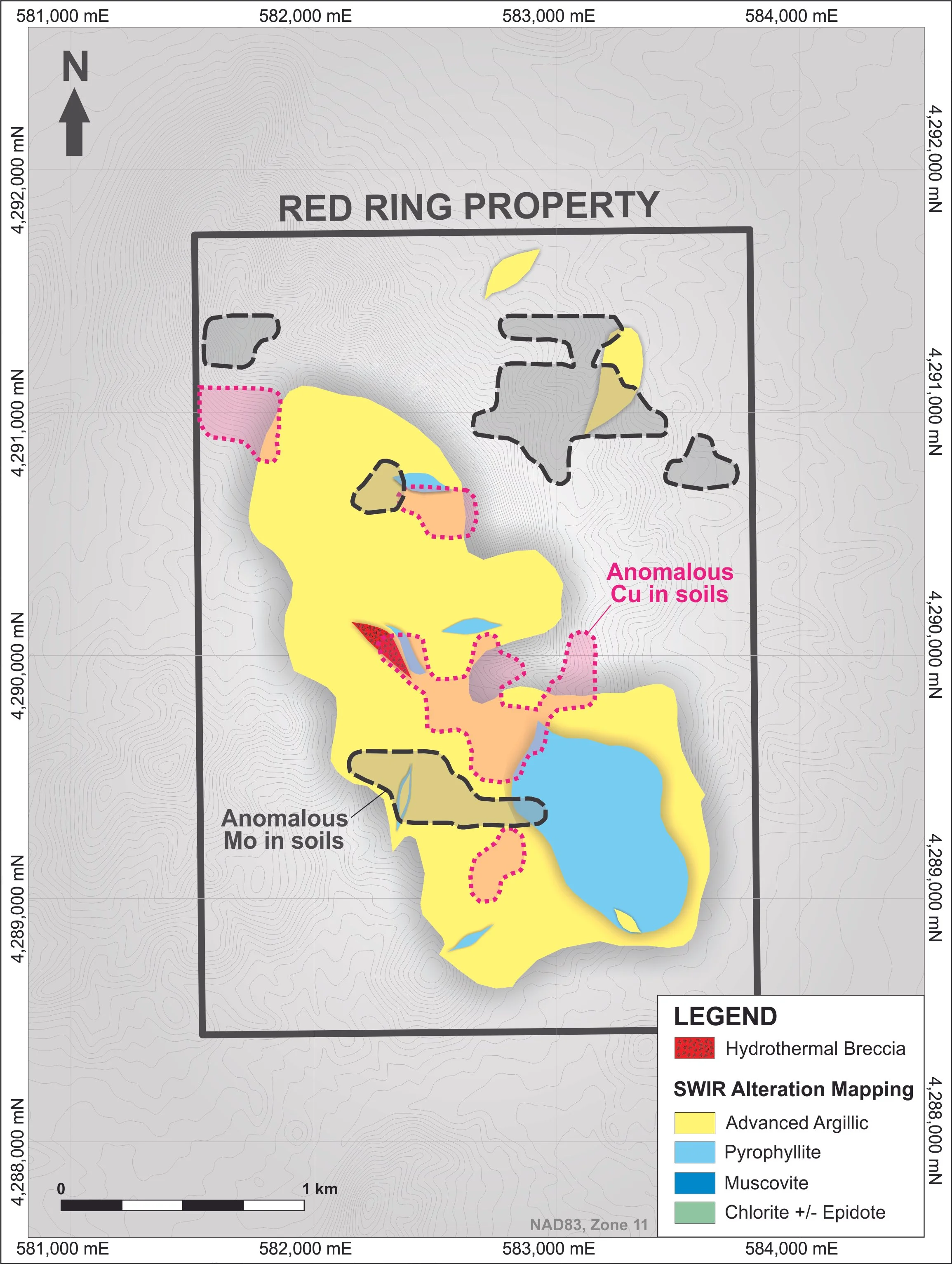 The Red Ring Property covers a 2.8 by 1.5 km area of intense hydrothermal alteration characteristic of a porphyry-epithermal lithocap environment.
